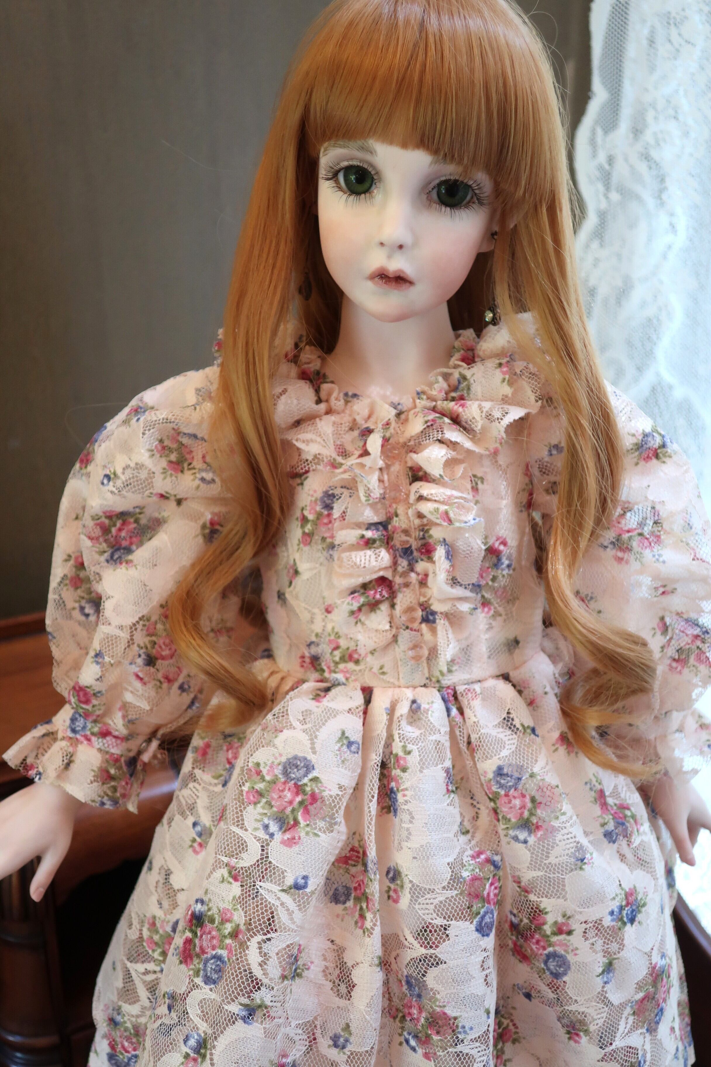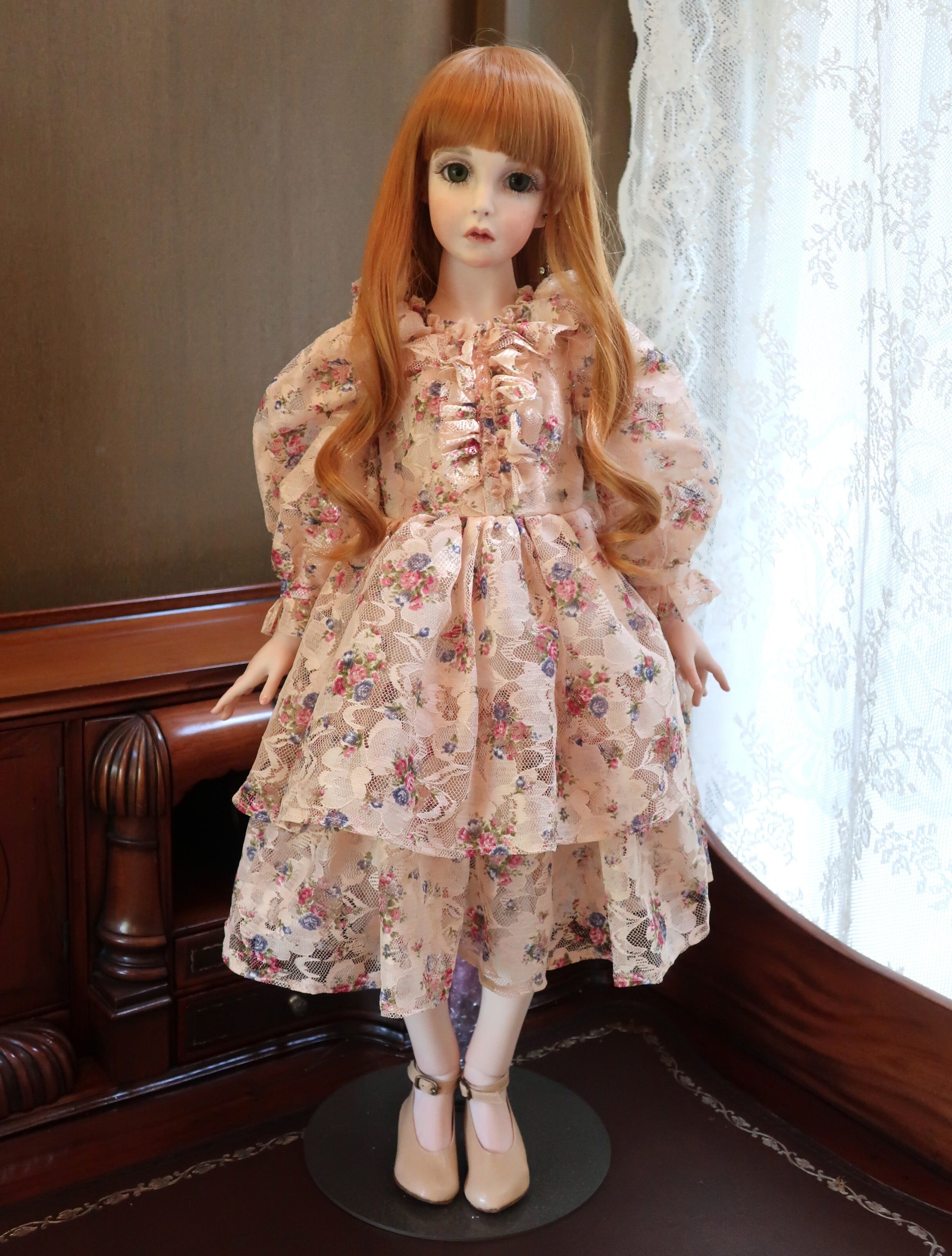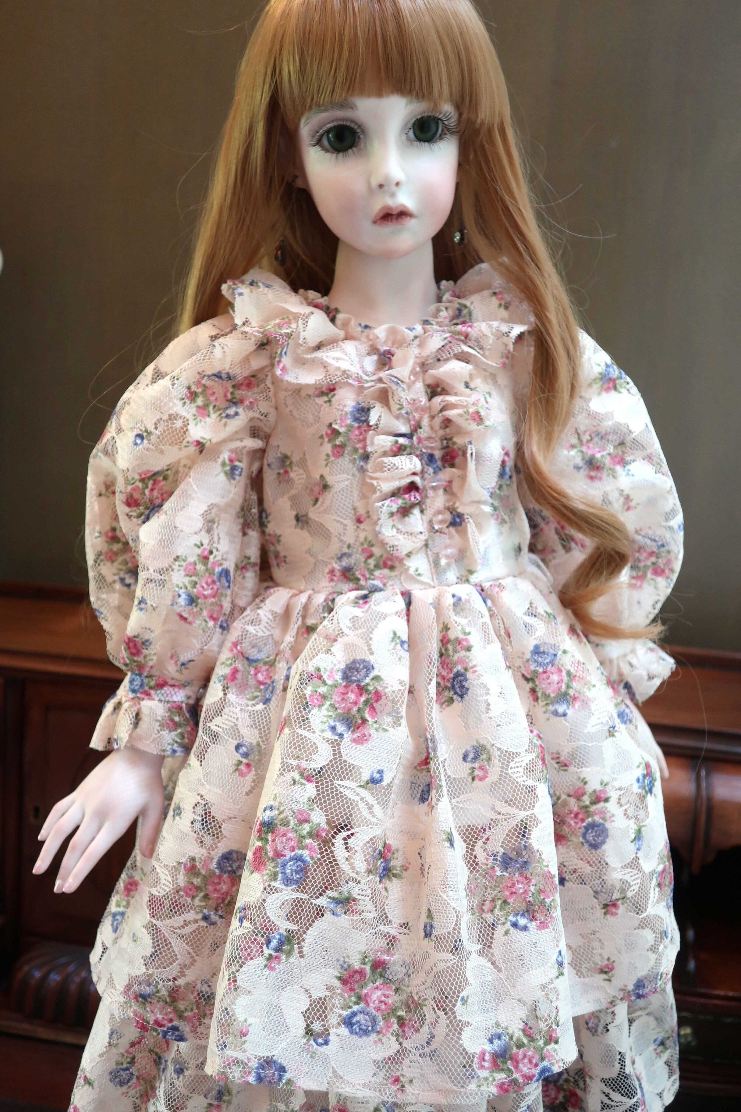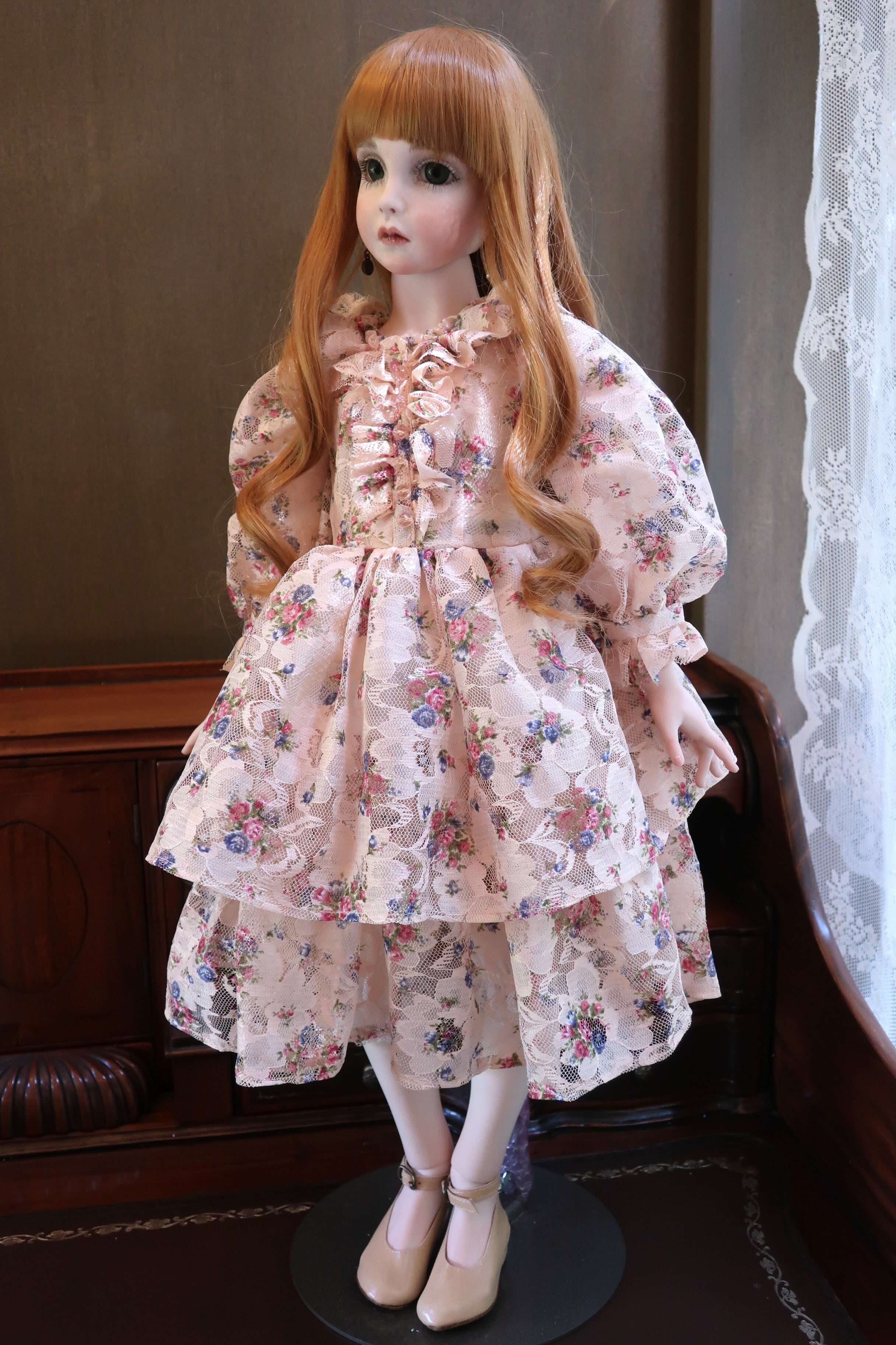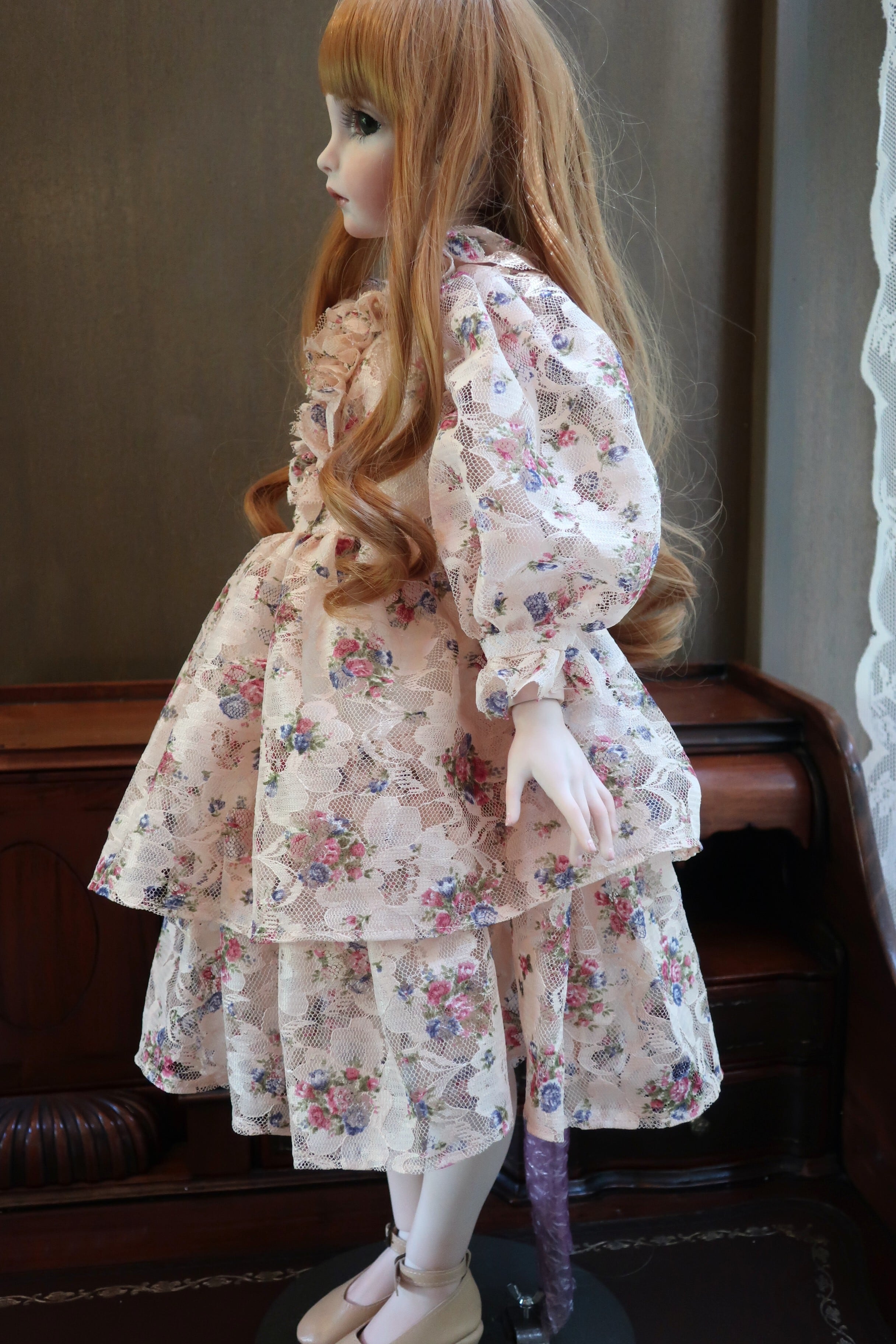 総柄のプリントレースのフワフワとしたドレスはミワドールの作品ですと45cm~60cm前後の作品向けです。着用写真のモデルはベラ(63cm)