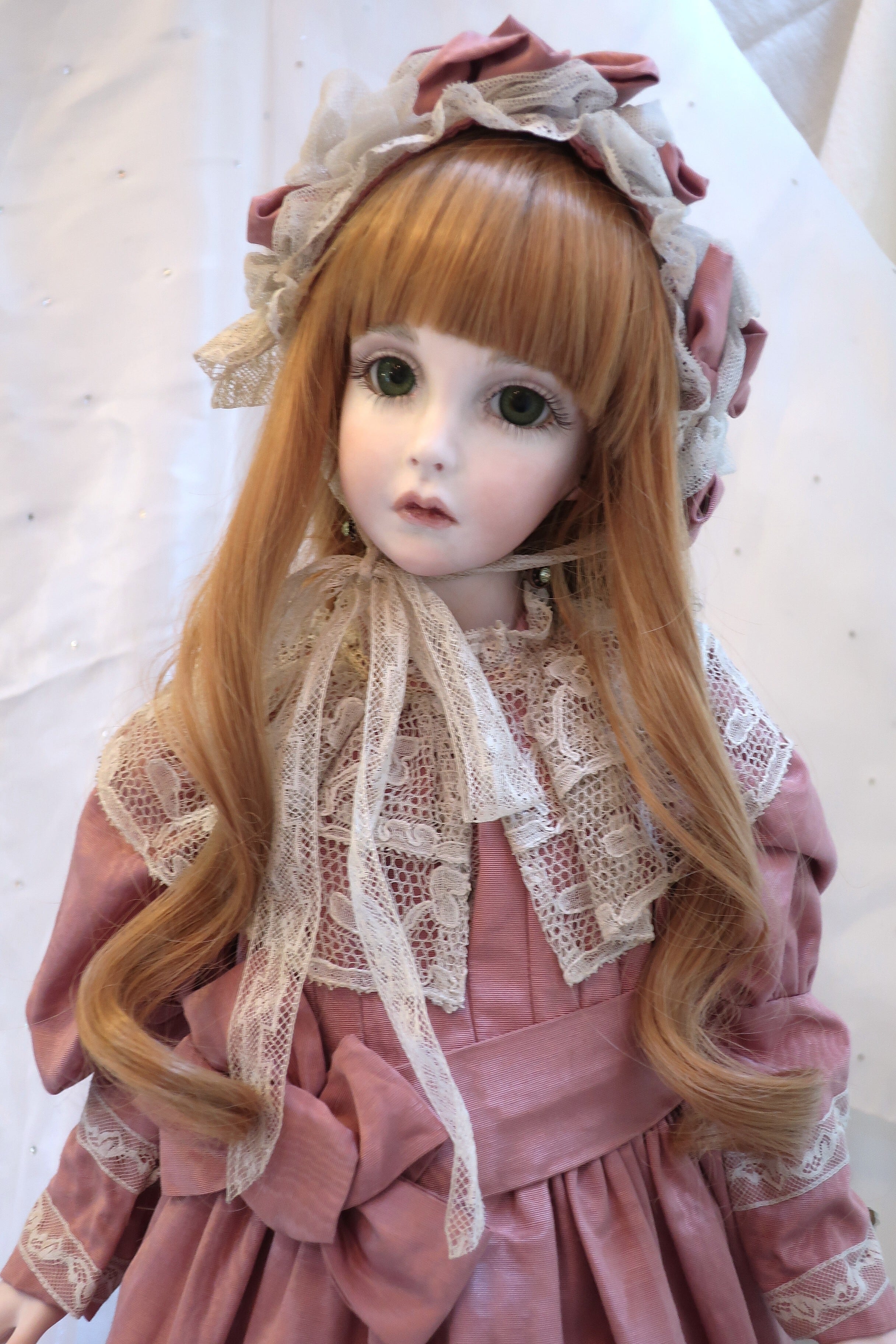 創作人形作家 三輪輝子のオリジナルビスクドール、落ち着いたピンク色に貴重なアンティークのレースを使用したドレスがロマンチックな作品です。