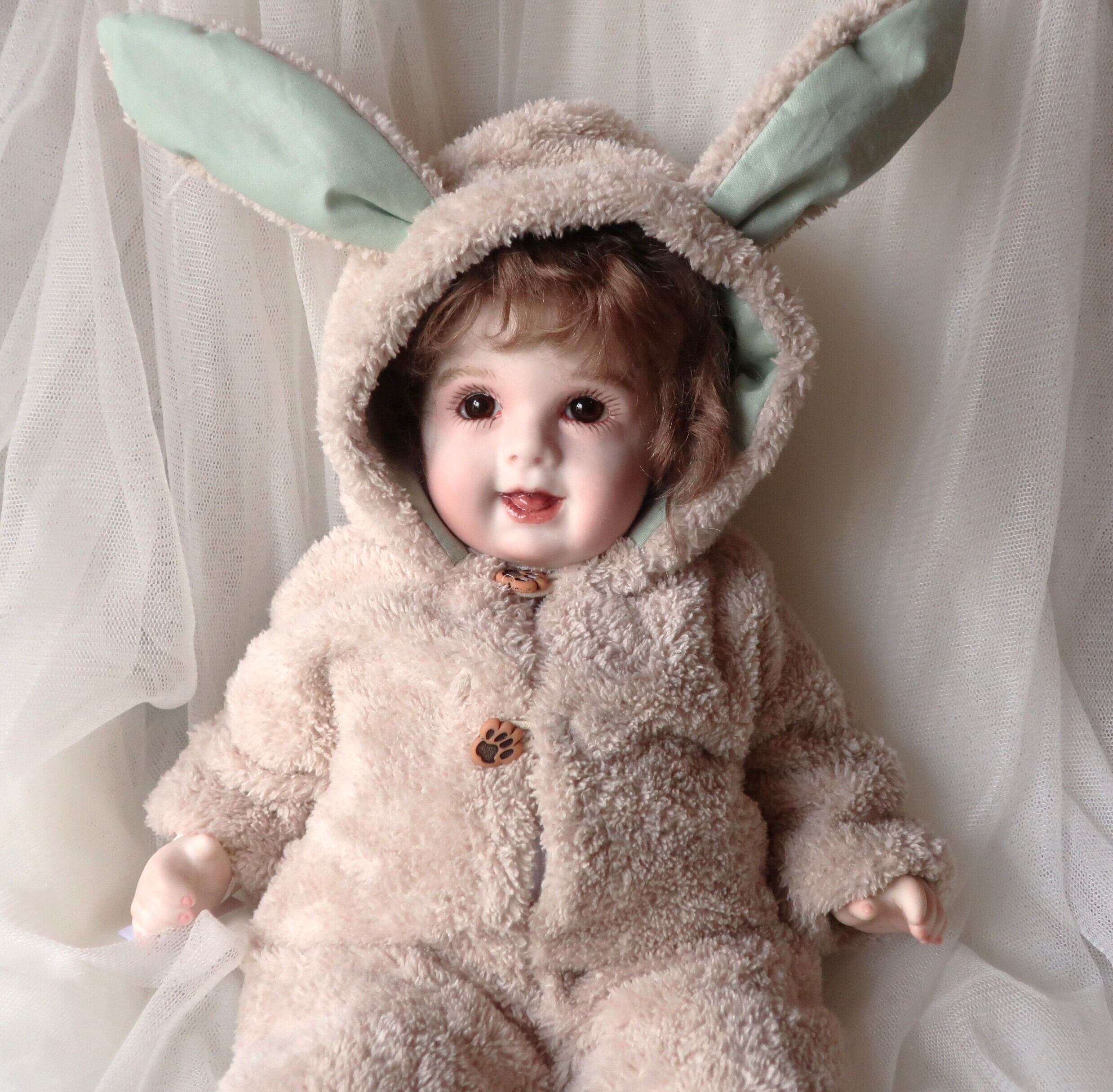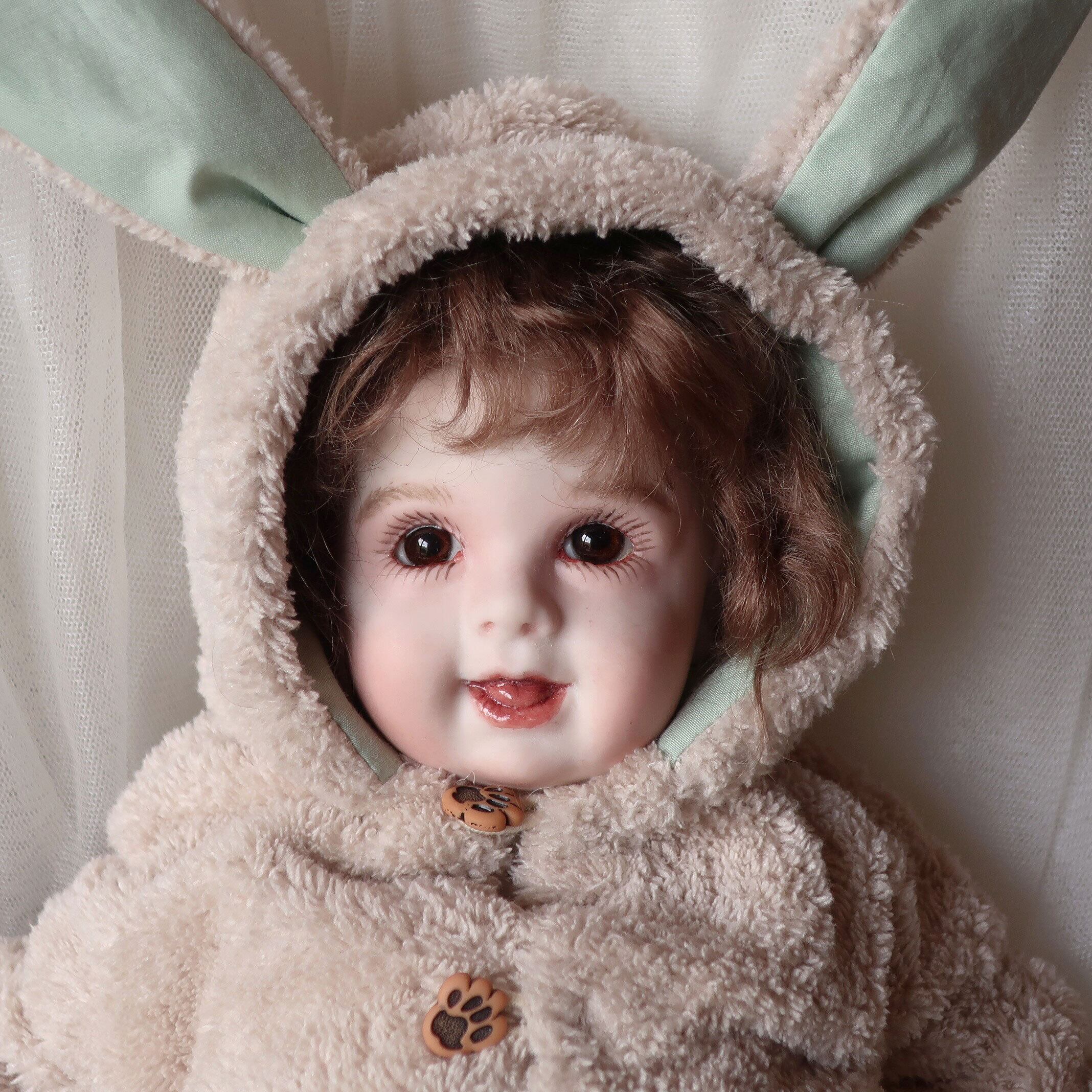 創作人形作家 三輪輝子の作品の中でもこの赤ちゃん人形<HB>ハニーベビーは、愛らしい表情に癒されるとコレクションしているファンの方も多いひと回り小さい<SB>シュガーベビーと並ぶ定番人気の作品です。