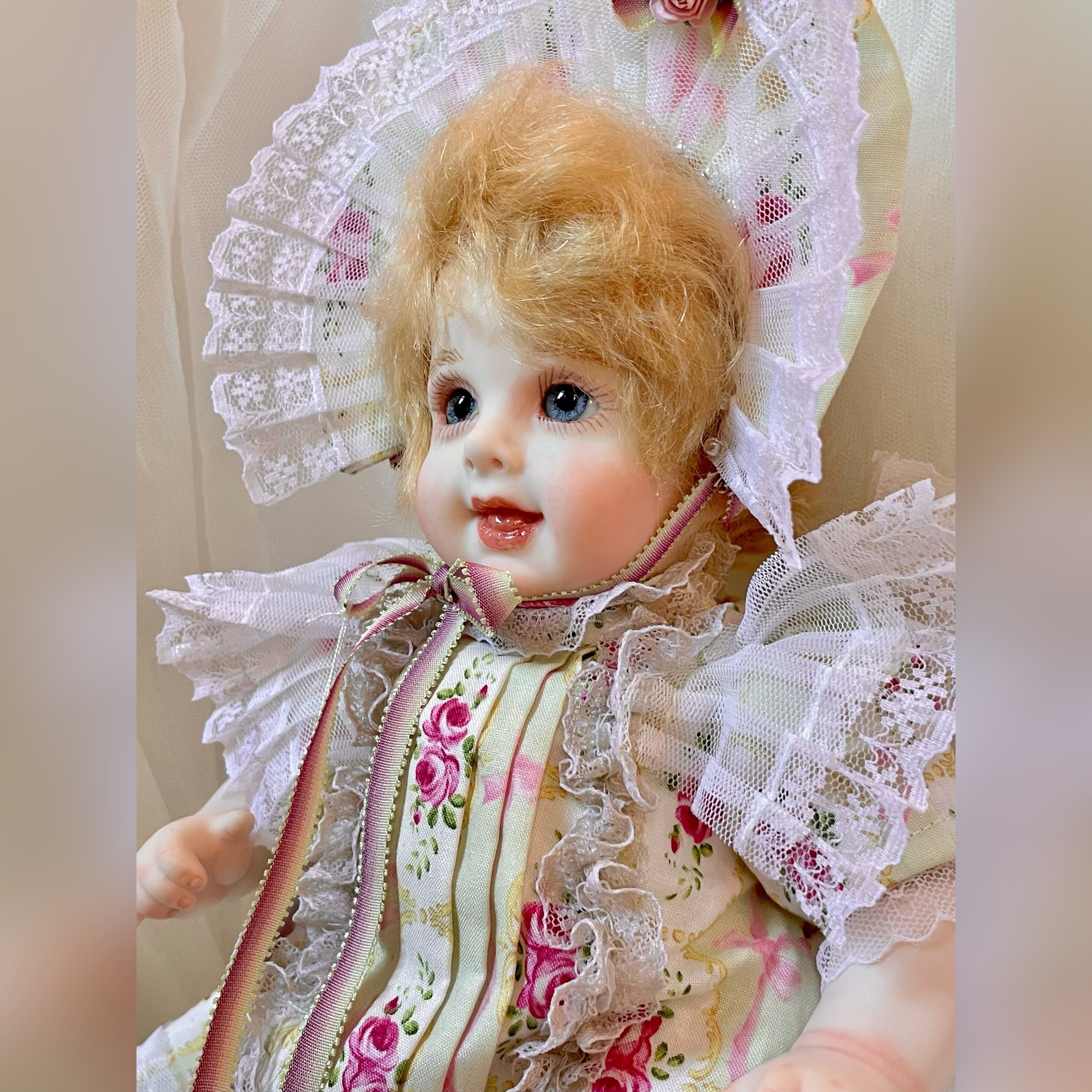 創作人形作家 三輪輝子の作品の中でもこの赤ちゃん人形<HB>ハニーベビーは、愛らしい表情に癒されるとコレクションしているファンの方も多いひと回り小さい<SB>シュガーベビーと並ぶ定番人気の作品です。