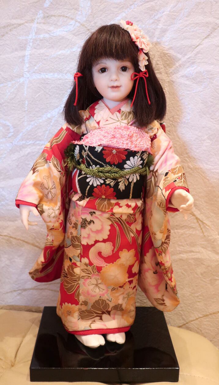 華やかな古典柄の着物に子供らしい少しクシャッとした微笑みが可愛らしい定番人気の和人形です。