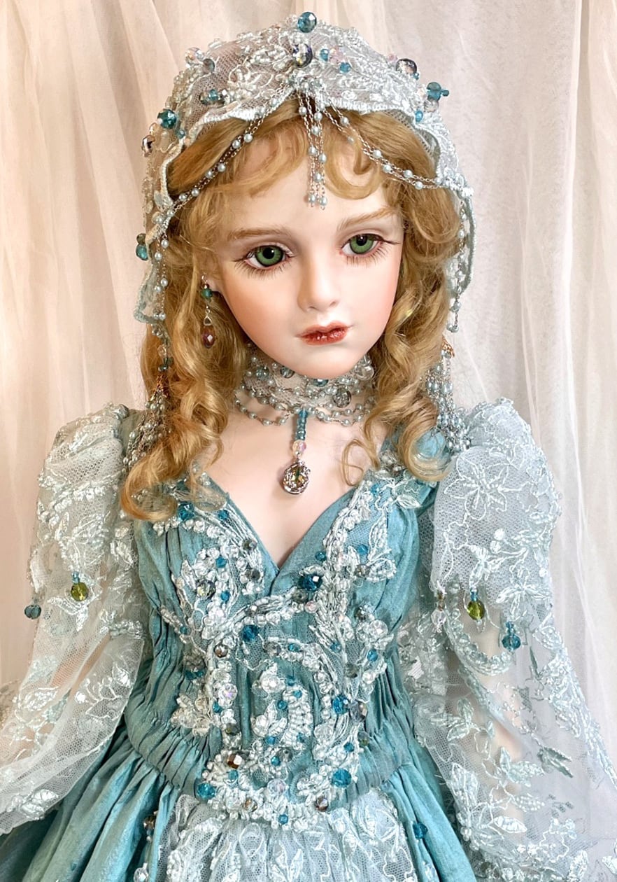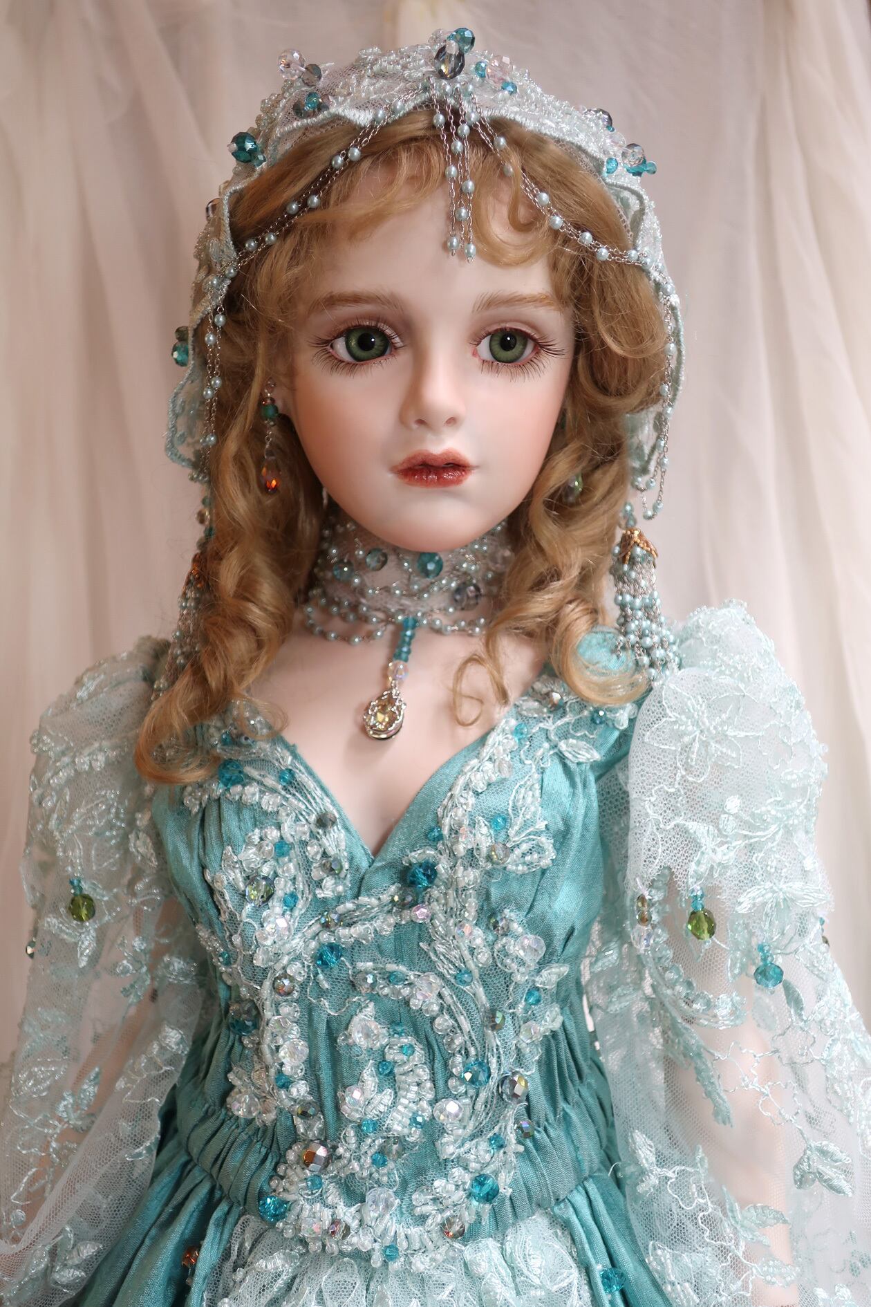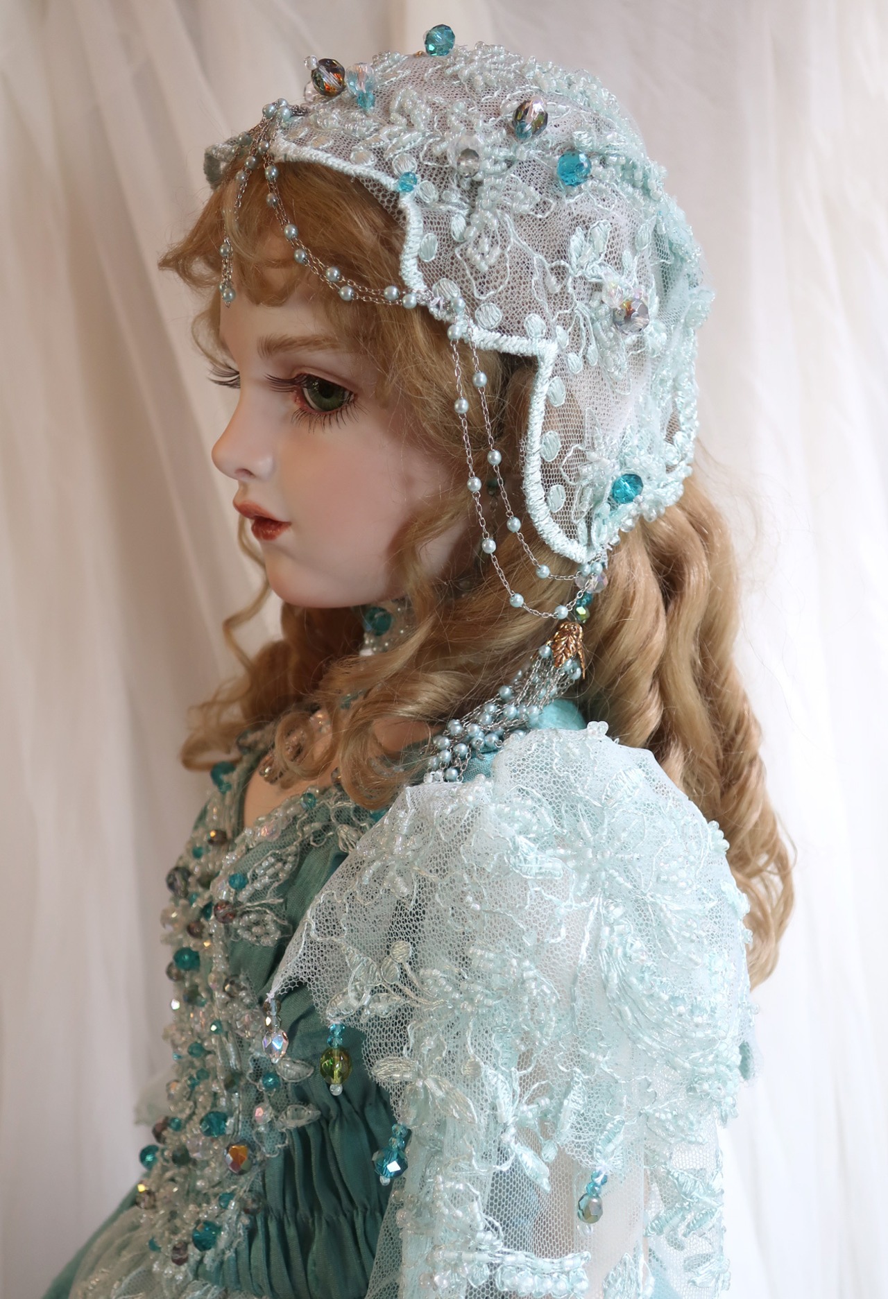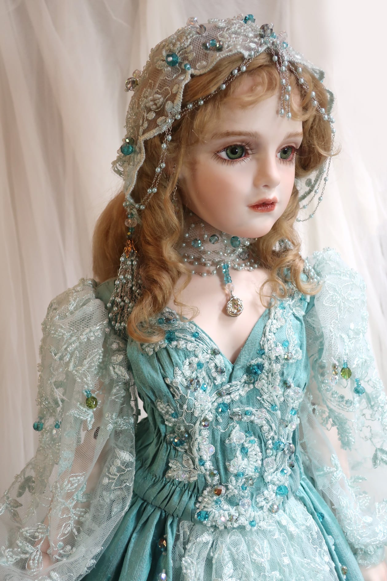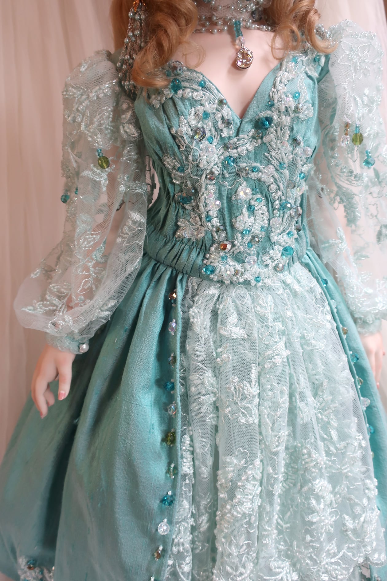 エメラルドグリーンの生地に同系色のビーズを手刺繍で施した煌びやかなドレスと、グリーン系の瞳の気品あふれる表情に目を惹かれる美しく華やかな作品です。