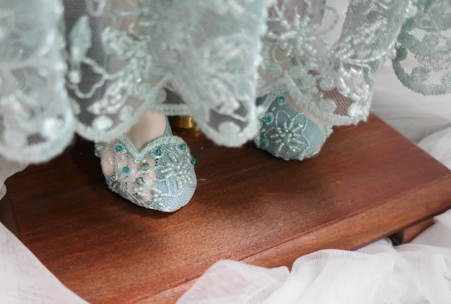 衣装:化繊タフタと刺繍入りレースのドレス、靴、ヘッドドレス、ドロワーズ、アクセサリー