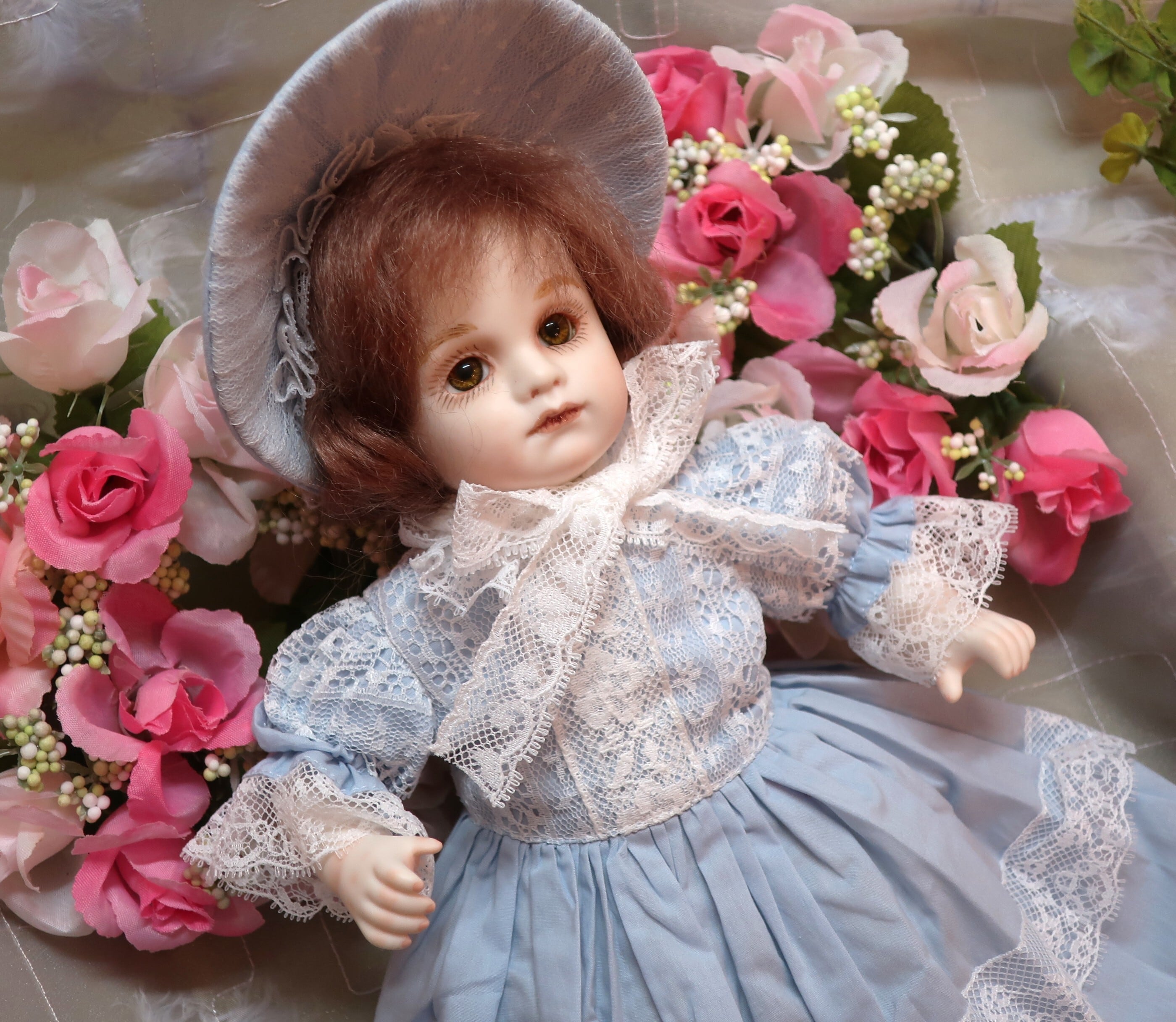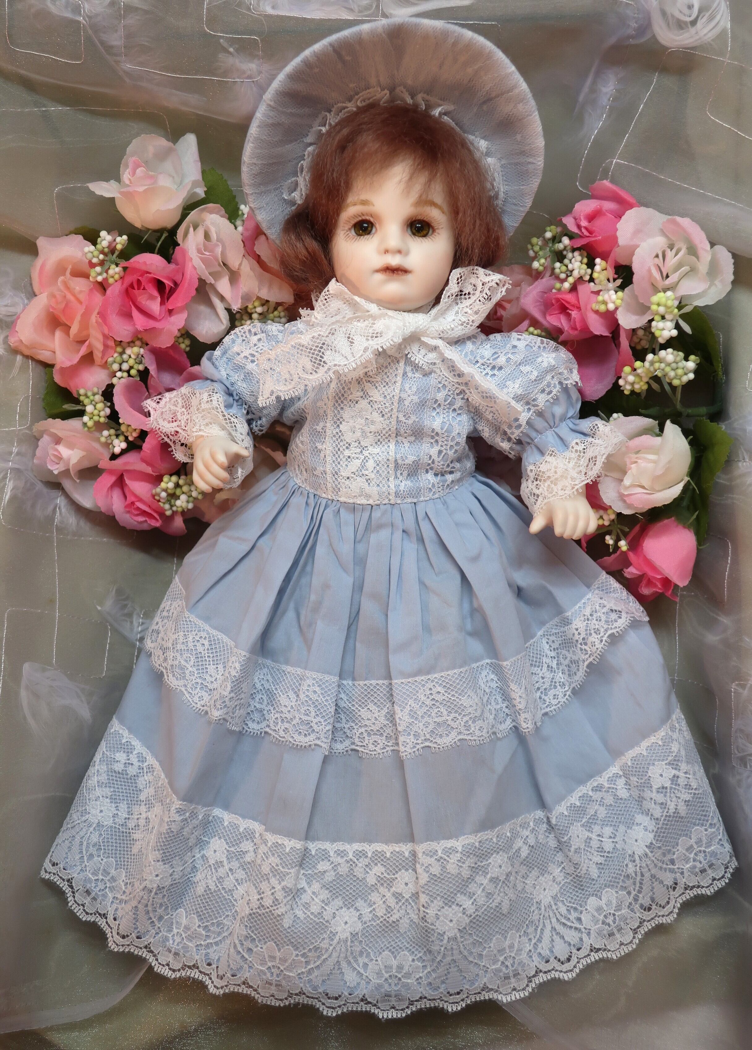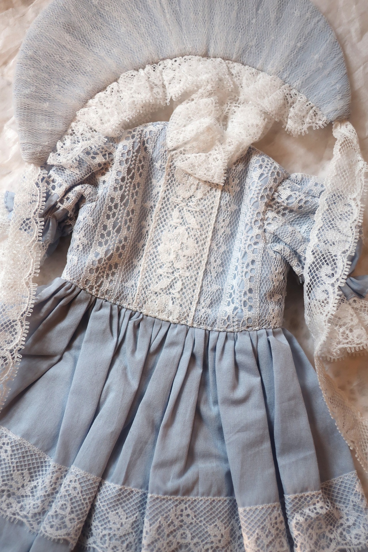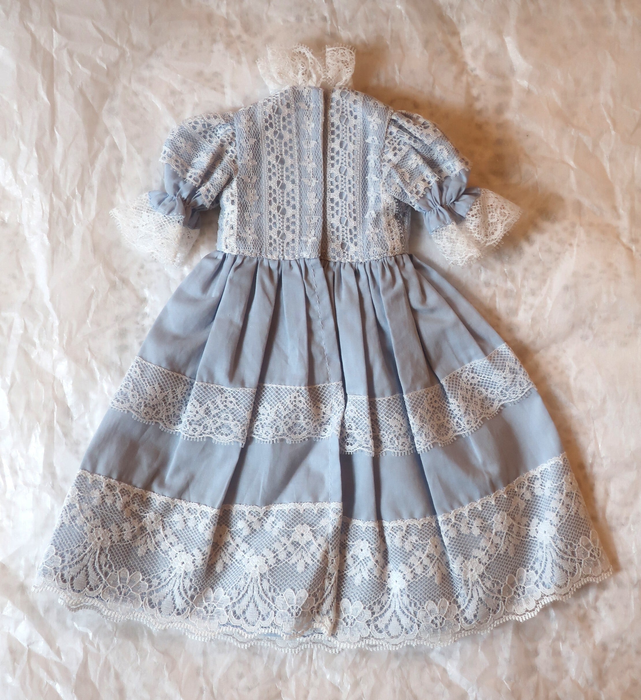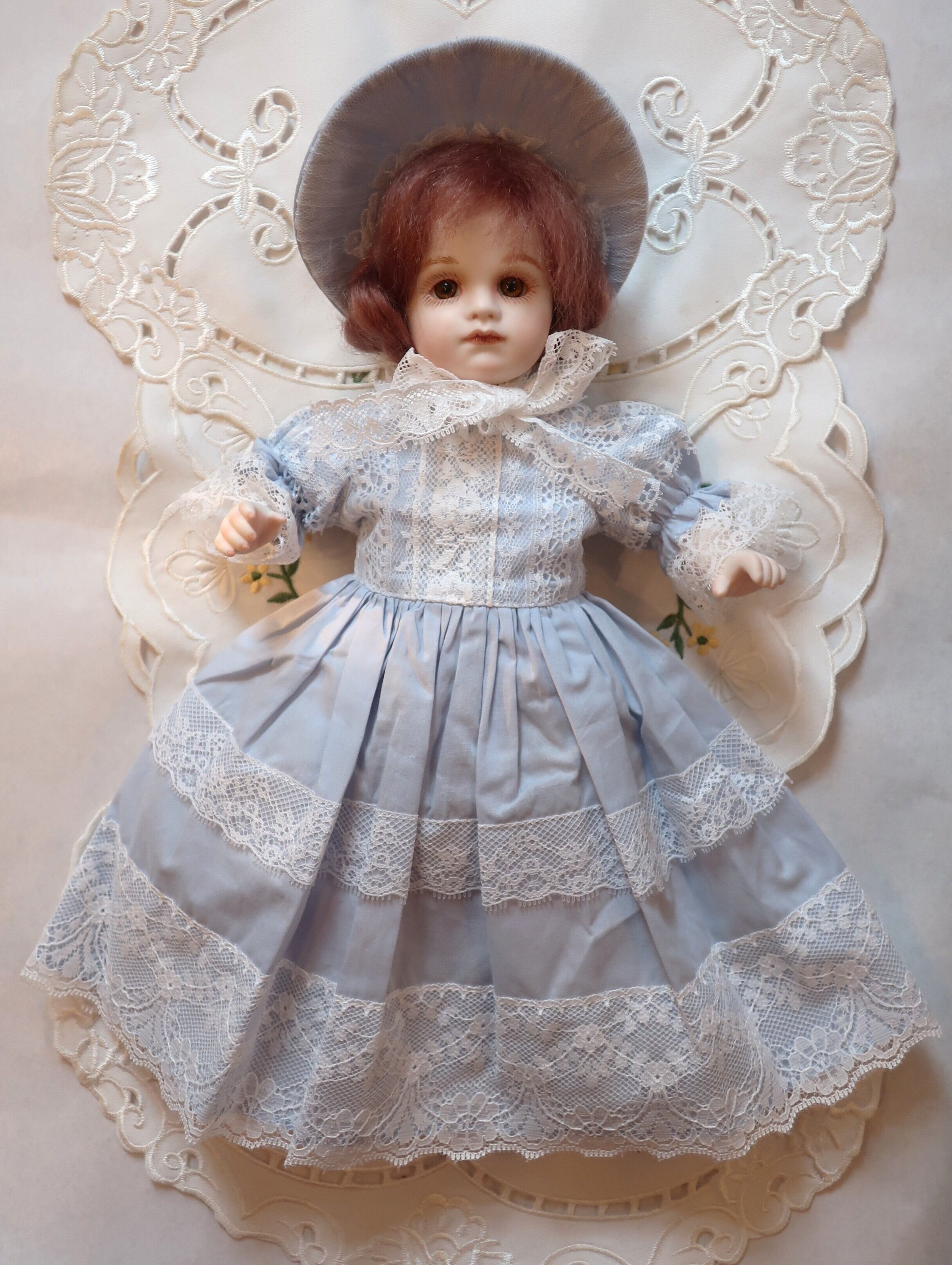 ドール用衣装 薄水色にレースのドレス、ボンネット付(40cm前後細身)