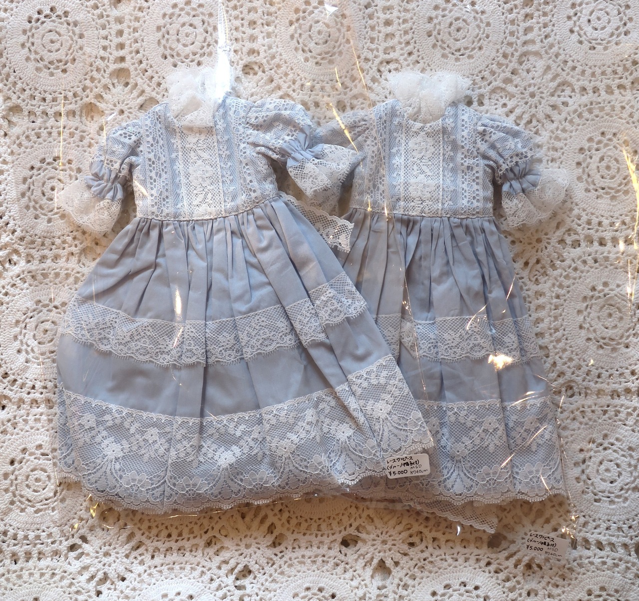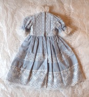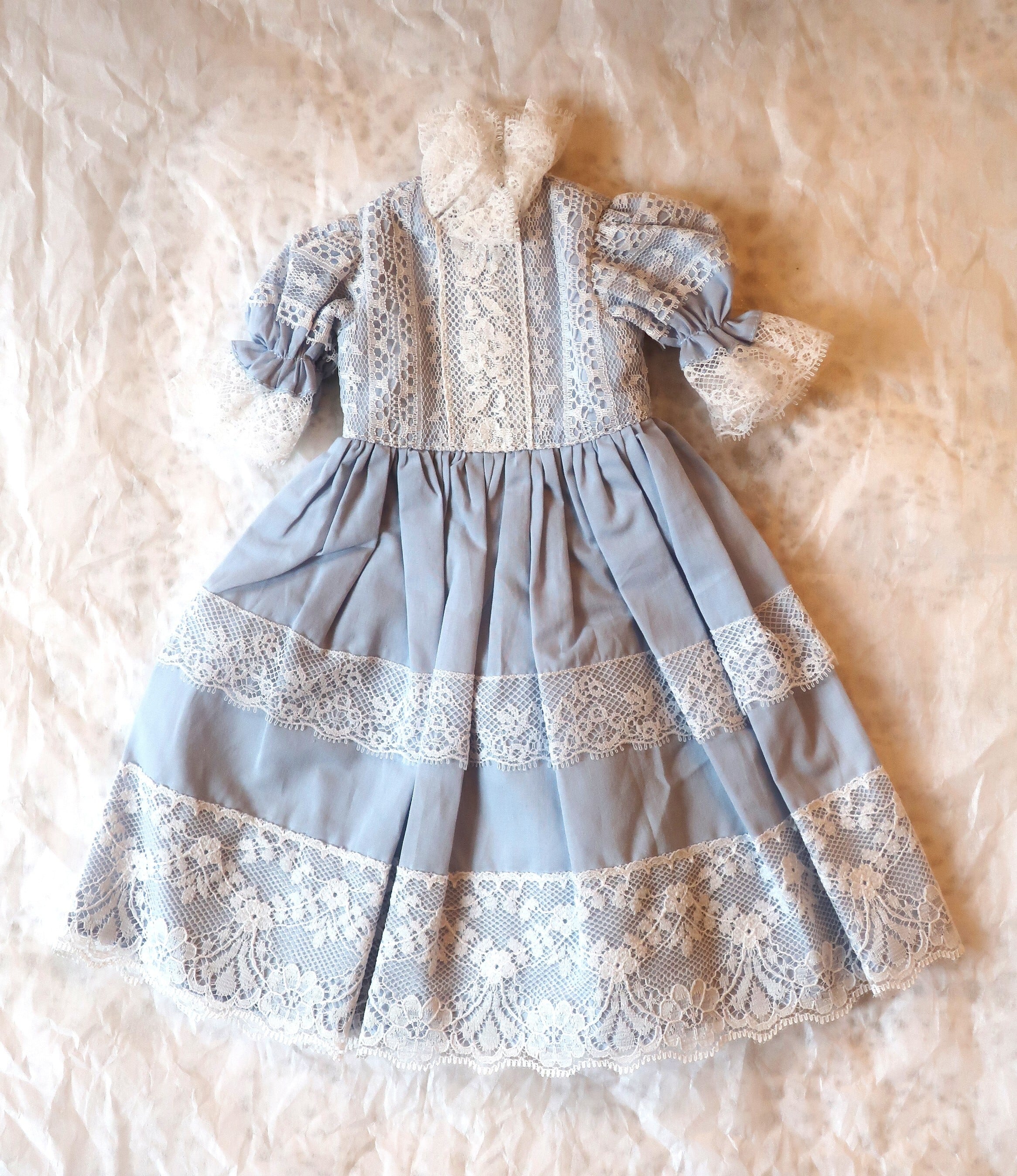 薄水色の落ち着いた色合いの無地の生地にレースを合わせたロマンチックなドレスです。